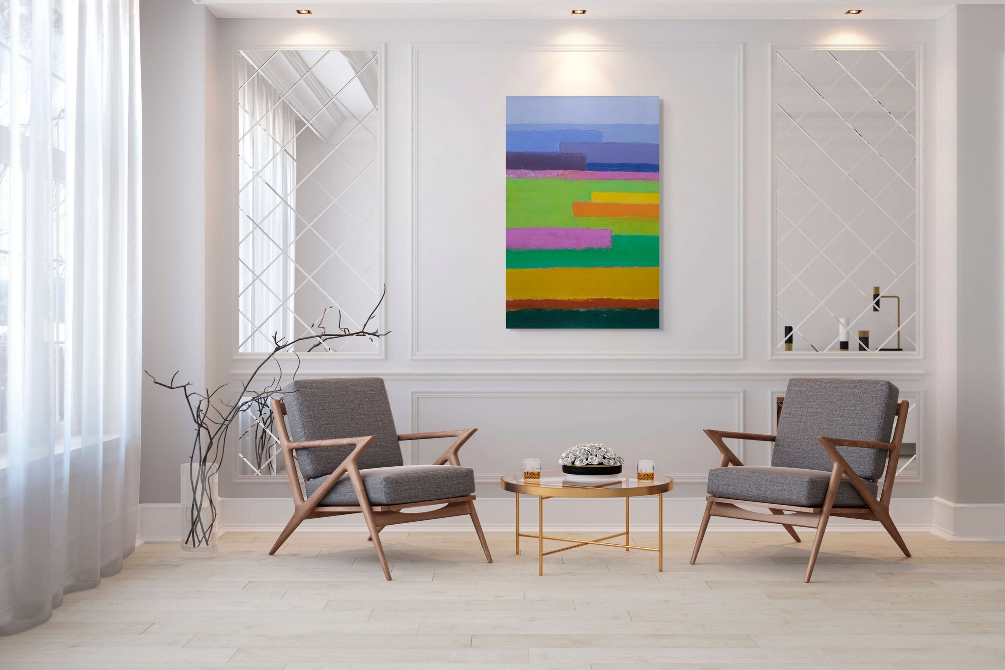 The painting was painted in Cold Wax and Oil Paint on board. Framed with elegant silver/champagne gold frame.